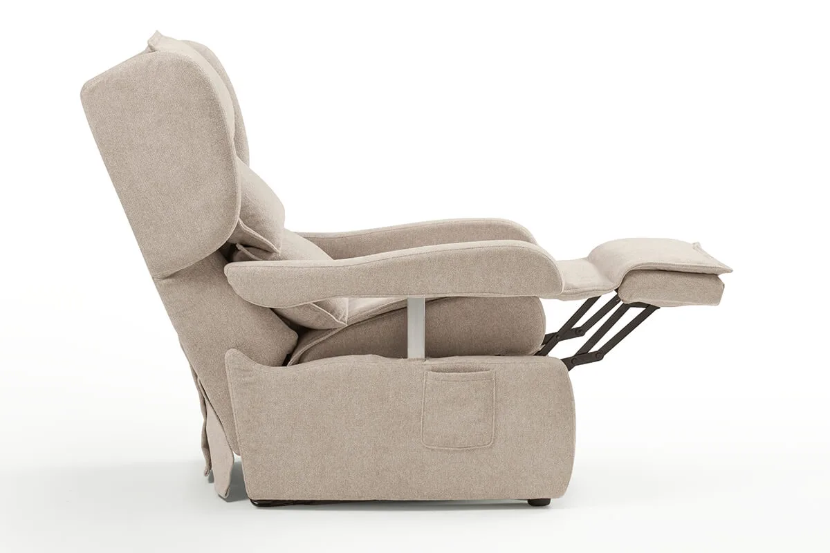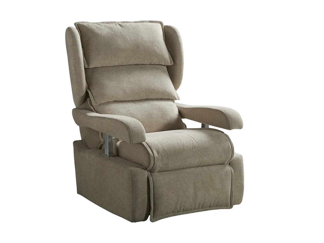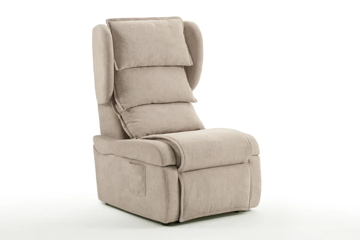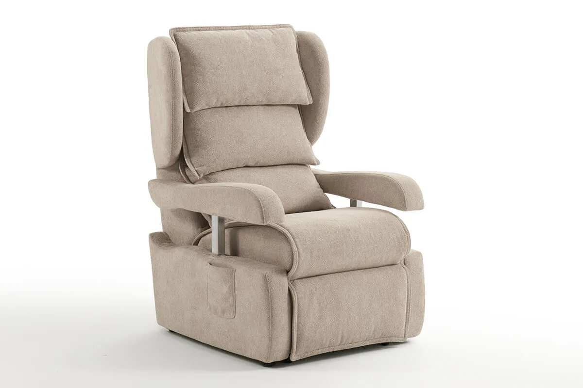 Olimpia offers cutting-edge comfort that takes care of people, thanks to a mechanical system designed to guarantee it is extraordinarily comfortable and fully reclinable. Furthermore, in a sitting position, it fits easily under a table thanks to armrests that can be lowered.