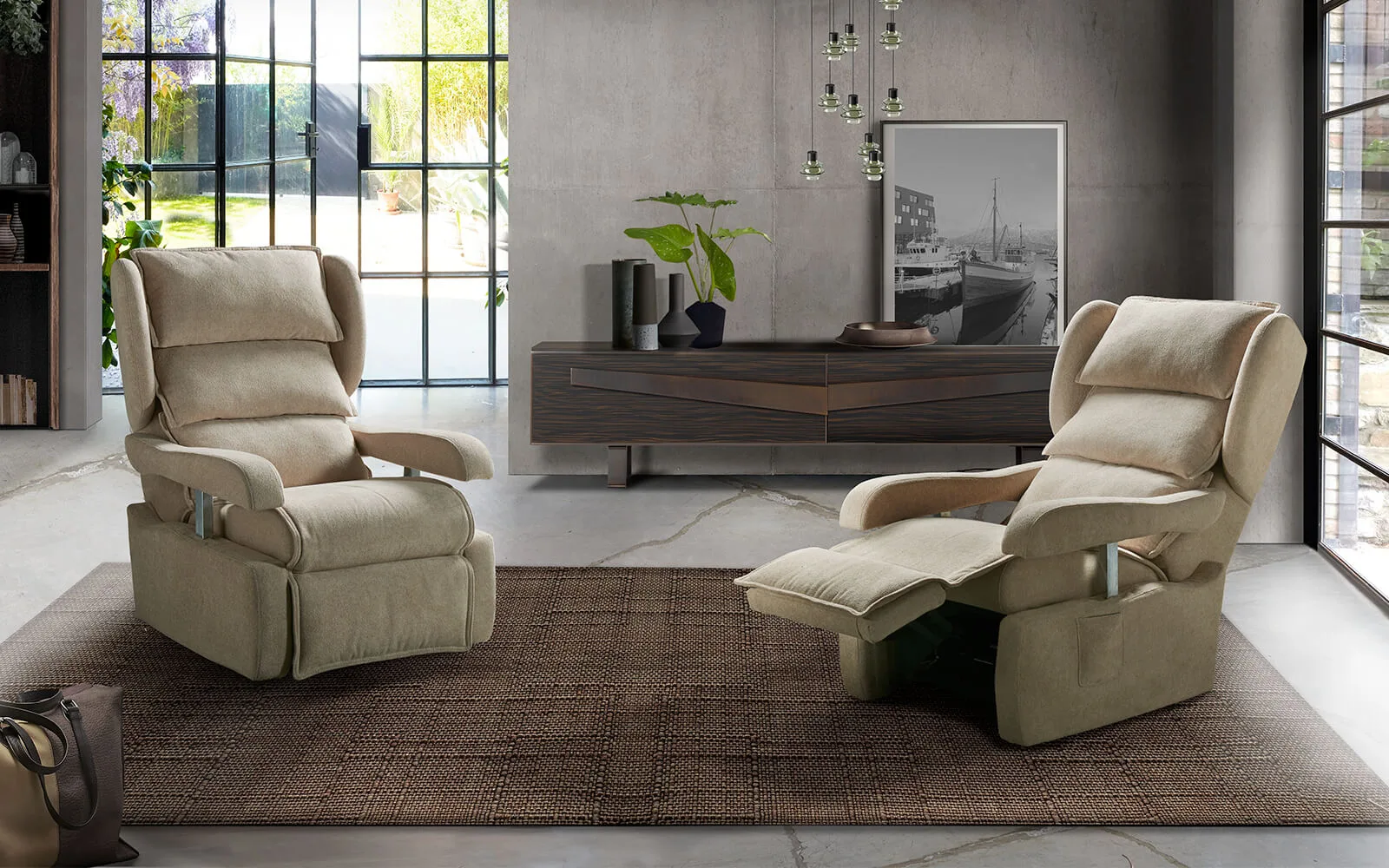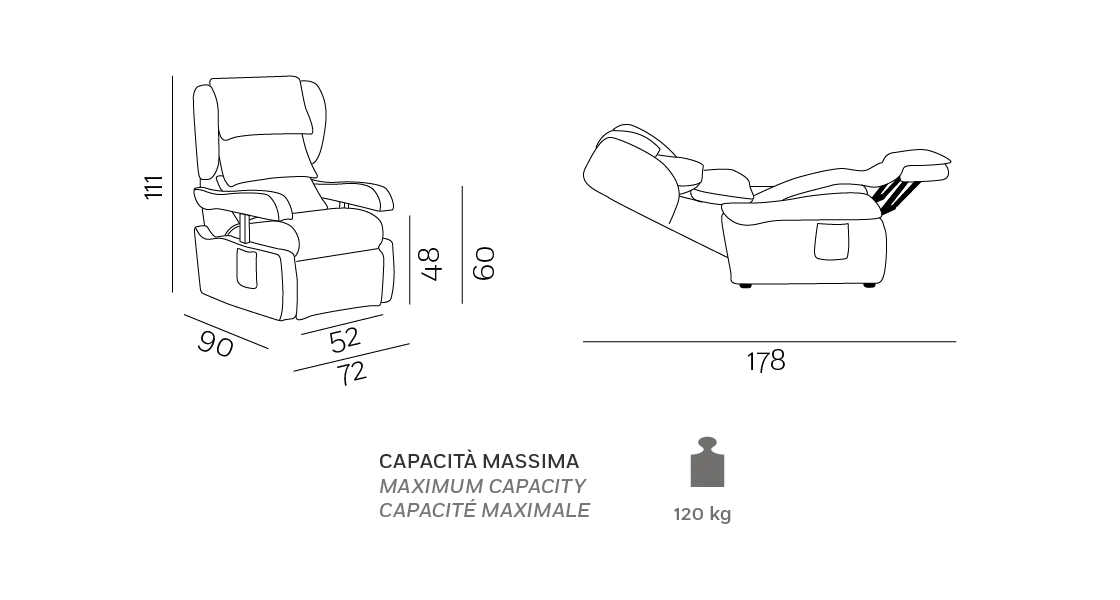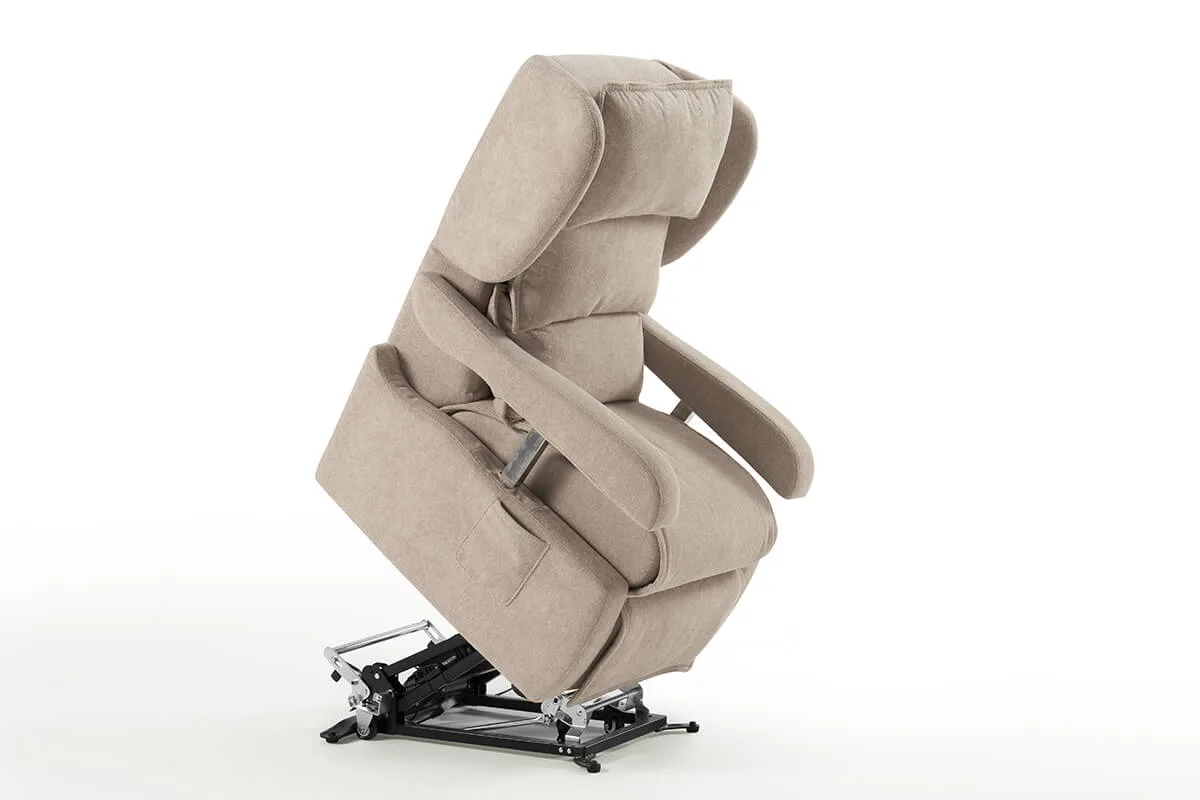 Olimpia offers cutting-edge comfort that takes care of people, thanks to a mechanical system designed to guarantee it is extraordinarily comfortable and fully reclinable. Furthermore, in a sitting position, it fits easily under a table thanks to armrests that can be lowered.